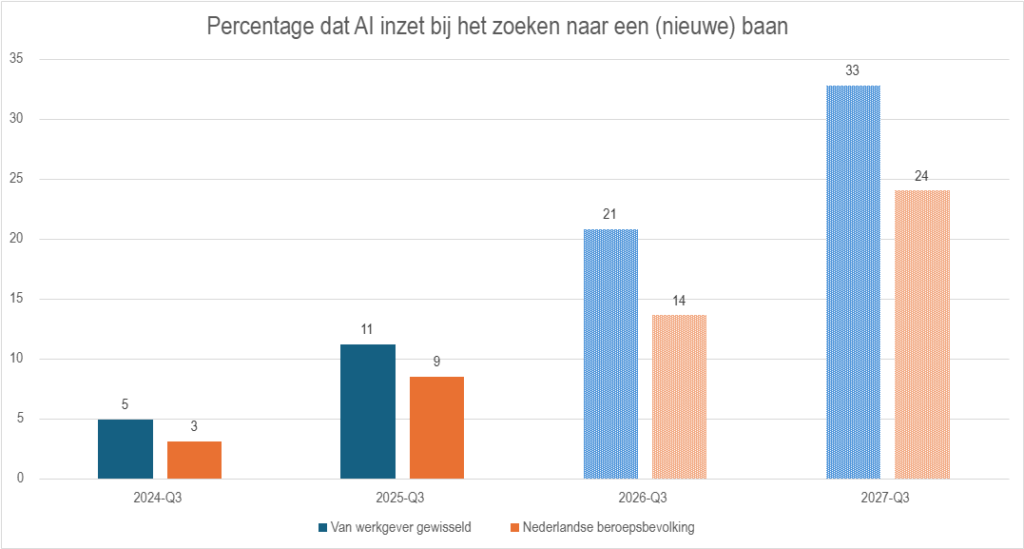 Uit onderzoek van Intelligence Group blijkt bovendien dat ChatGPT inmiddels bij veel werkgevers een top-10-bron van verkeer naar hun werkenbij-site is. In sommige gevallen zelfs top-3. Waasdorp spreekt van een ongekend snelle adoptie: begin 2027 verwacht hij dat AI-systemen zoals ChatGPT tot 30% van alle baanoriëntatie voor hun rekening nemen.