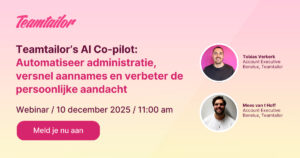 Je leert hoe je AI op een praktische en ethische manier inzet binnen recruitment met Teamtailor, hoe Co-pilot tot 80 procent van je administratieve werk kan overnemen, zoals het opstellen van berichten, het suggereren van kandidaten en het samenvatten van interviews. Ook ontdek je hoe je je talentpool opnieuw activeert door bestaande kandidaten te matchen met openstaande functies en hoe Ask Co-pilot je ondersteunt bij snellere, beter onderbouwde beslissingen. Tijdens het webinar zie je Co-pilot live in actie en krijg je de ruimte om vragen te stellen.
